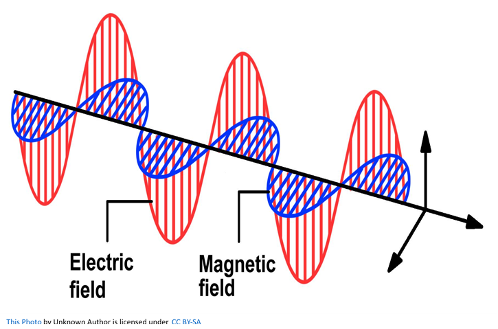 Although light is generally said to be a wave, unlike the waves that occur at the surface of a body of water, it does not require a medium. As shown below light consists of an electric field and a magnetic field that intersect each other at a right angle as they move through a vacuum. The energy in light travels because of local fluctuating changes in electrical and magnetic fields; hence “electromagnetic” radiation.