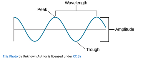 If you draw a beam of light in the form of a wave, without worrying too much about what exactly is causing the wave, the distance between two crests is called the wavelength of the light. It could equally well be the distance between two troughs or any other two identical positions on the wave. You must picture these wave crests as moving from left to right. If you counted the number of crests passing a point per second, you have the frequency of the light. It is measured in what used to be called “cycles per second”, but is now called Hertz, Hz. Cycles per second and Hertz mean the same thing. Light has a constant speed through a given substance. For example, it always travels at a speed of approximately 3 x 108 meters per second in a vacuum. This is the speed that all electromagnetic radiation travels not just visible light. There is a simple relationship between the wavelength, frequency, and the speed of light, shown below.