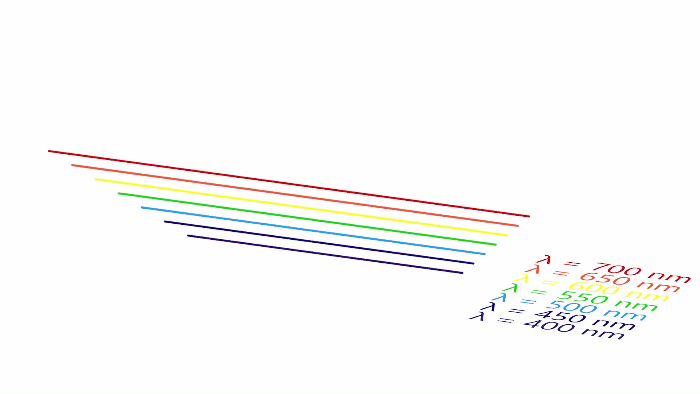 This relationship means that if you increase the frequency, you must decrease the wavelength and, of course, the opposite is true. If the wavelength is longer, the frequency is lower. It is important that you feel comfortable with the relationship between frequency and wavelength. Each frequency of light has an energy associated with it. The higher the frequency, the higher the energy of the light. Light which has wavelengths of around 380 nm to 435 nm is seen as a sequence of violet color. Various red colors have wavelengths around 625 nm to 740 nm. Which has the highest energy? The light with the highest energy will be the one with the highest frequency, that will be the one with the smallest wavelength.