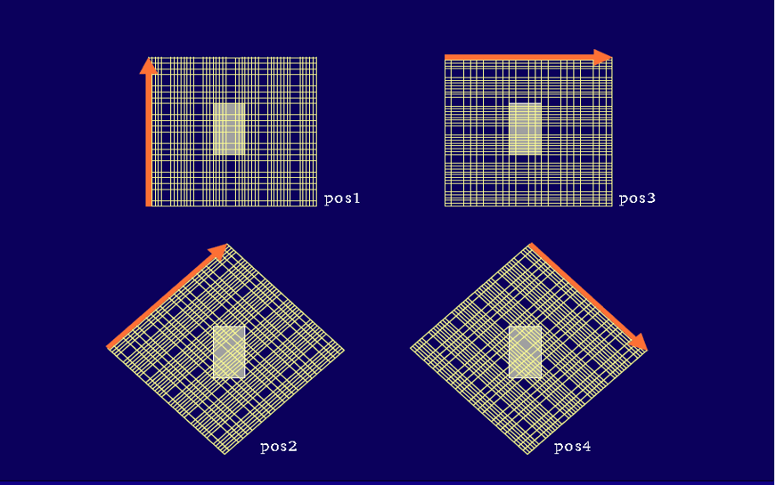 For samples with a distinct surface texture or pattern, the orientation of the sample around the beam axis can result in different spectra. The picture below demonstrates a woven fabric sample with a regular weave. We will investigate orientation effects by measuring the fabric in four unique positions in the beam. The four positions rotate the sample around the central beam axis by both 45 degrees and 90 degrees. Note the orange orientation arrow on the sample to follow the individual rotations. The lighter rectangle in the weave represents the instrument’s beam on the sample.