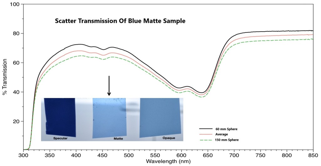 The matte sample below has considerably more light scattering ability. Note the much greater separation between the spectra from the two size spheres for this sample. Which spectrum is accurate?….. probably neither. All sphere measurements should be considered approximate rather than absolute. All integrating spheres must have holes to accommodate light entry into the sphere and they must also have non-coated areas to accommodate the detectors. As such, these areas allow light to escape measurement by the detector. The complex dance between port fraction and integration ability makes it very difficult to try and estimate the contribution for each property. The best one can due when comparing the transmission of significantly scattering samples between different sphere sizes would be to average the spectra for the best approximation.
