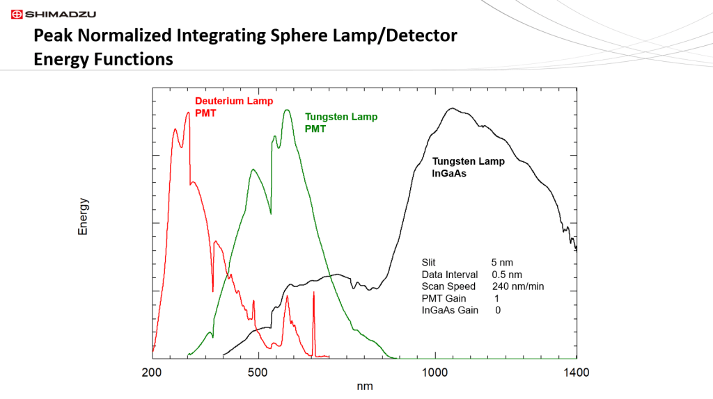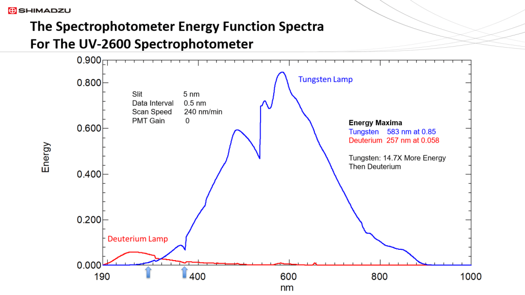 The Shimadzu UV-2600 spectrophotometer energy function is typical of most UV/Vis instruments. The instrument has a photomultiplier tube for a detector, with a range of 185 nm to 900 nm. As an accessory, an InGaAs detector integrating sphere can be fitted onto the instrument. Displayed here is the energy distribution spectra of the tungsten and deuterium lamps at the same PMT gain setting. Additionally, both energy spectra were measured with identical instrumental parameters of slit, data interval, and scan speed. Typical of two lamp spectrophotometers, the deuterium lamp UV region is less energetic than the visible and short wavelength NIR regions. Note also that the tungsten/deuterium lamp change-over wavelength point can be set between 290 nm to 370 nm. This is the wavelength region between the two blue arrows; however 323 nm is the default optimal change-over point. This is also the wavelength where the tungsten and deuterium energy spectra cross over each other. The energy spectrum of the tungsten lamp, that covers the wavelength region from 323 nm to 1400 nm has much greater energy than the deuterium lamp. Since the PMT gain was the same for both lamp regions, a comparison can be made about peak energy levels for each lamp. At their peak wavelengths, the tungsten lamp has 14.7 times more energy than the deuterium lamp.