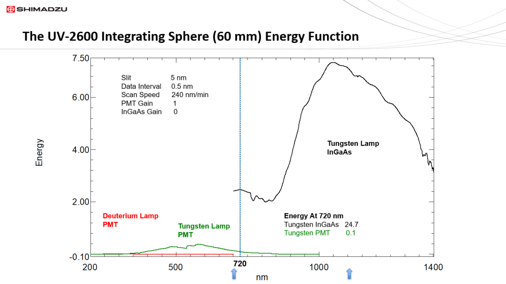 The UV-2600 spectrophotometer’s 60 mm sphere has both a PMT for the UV/Vis region and a more sensitive solid state InGaAs detector for the short near infra-red (NIR) region (900 nm to 1400 nm). Modern InGaAs detectors are typically two orders of magnitude more sensitive in the NIR than the older lead sulfide (PbS) detectors. The sphere InGaAs detector is at least 247X more sensitive at 720 nm from PMT to InGaAs detector. This is well over a two order of magnitude increase. The PMT to InGaAs change-over is selectable between 700 nm and 1100 nm with the optimal point at 860 nm. This is the wavelength range between the two blue arrows. An InGaAS detector is usable well into the visible wavelength region.