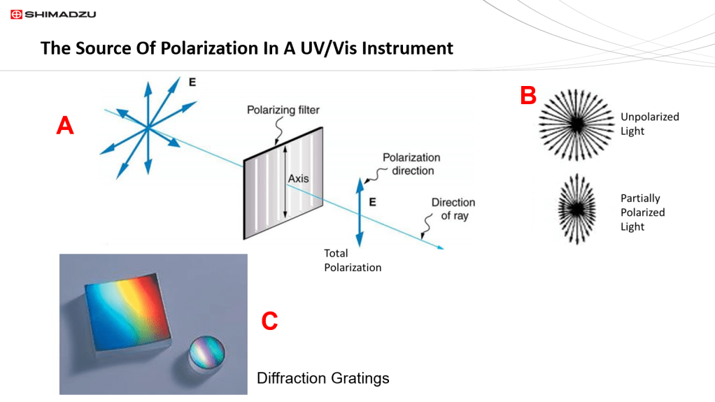 The diagram labeled A shows the production of 100% plane polarized light generated by a polarization filter. However, there are numerous processes that create partially polarized light where most of the light tends toward a single plane, but there are also other “residual” planes produced. Partially polarized light is shown in B where we are looking into the light beam and can see the difference between unpolarized and partially polarized light. Light is partially polarized when it reflects from a specular surface such as a mirror. The light from ANY diffraction grating monochromator is always partially polarized. The sources of this polarized light are the optics, both mirrors and the diffraction grating (C). Diffraction gratings tend to partially polarize light along the plane of the lines on the grating. This usually is not an issue when measuring solutions or isotropic solids such as a glass; however, this instrumental polarization can cause spectral artifacts when non-isotropic samples, usually solids, are measured. Since samples don’t come with labels on them saying, “caution polarizer”, it is therefore important for spectrophotometer operators to be able to identify possible polarizing sample material. We will now look one way to identify possible polarization artifacts that employs energy spectra.