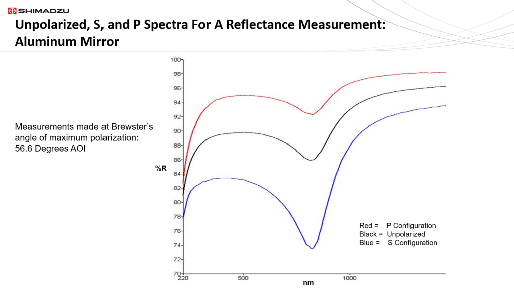 The instrument they were measured on was equipped with a depolarizer filter to remove the native polarization artifact and a Glan-Taylor analysis polarizer with a usable wavelength range between 220 nm to 2000 nm. Reflectance is always only partially polarized. This is true for all metallic surface reflections where the degree of polarization is angle of incidence (AOI) dependent. Typically AOI’s that are near normal lack any polarization. As the AOI rises above 15 degrees, the polarization of reflected light increases to a maximum at Brewsters’s angle, which is 56.6 degrees for aluminum.